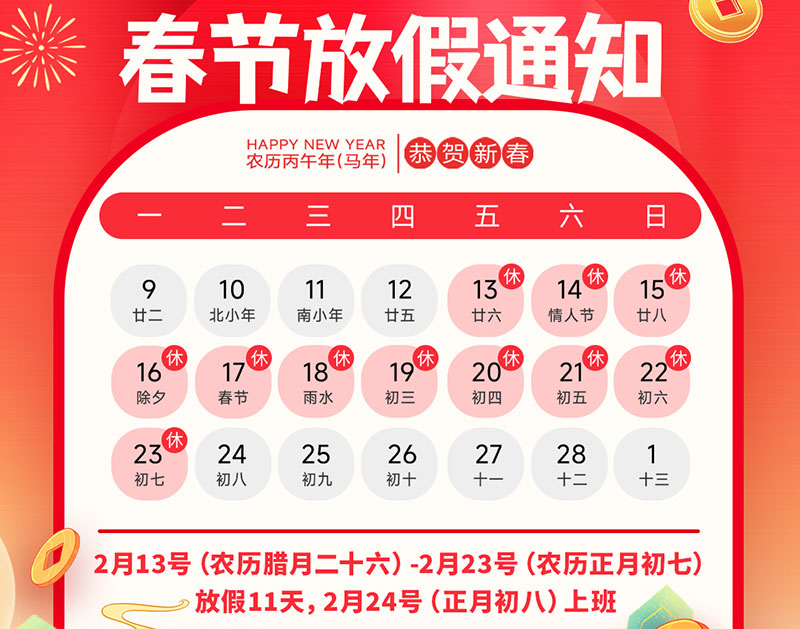 Thank you for your trust and support over the past year. Please be informed of our company’s 2026 Chinese New Year holiday schedule as follows: